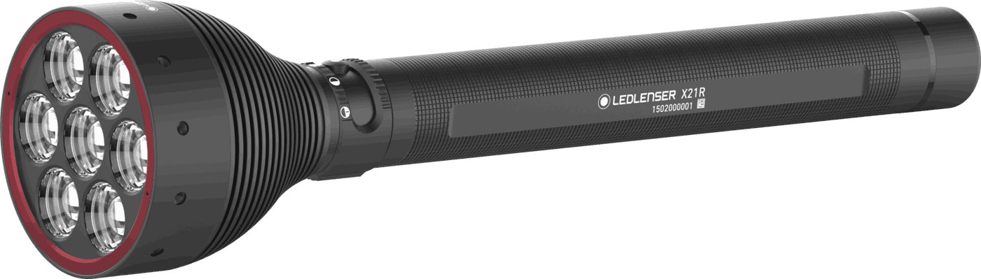 Ledlenser X21R er en meget kraftig, oppladbar håndlykt på opptil 5000 lumen, og maksimal driftstid på 40 timer. Rekkevidde opp mot 800 m.