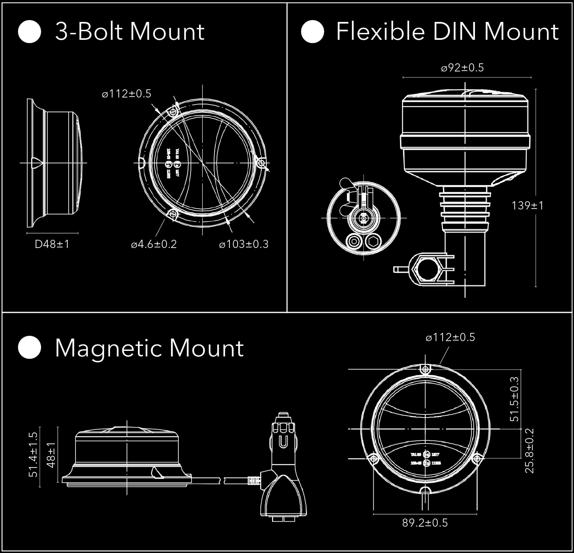 Rund strobelys LED med sterkt magnetisk feste. Inkluderer roterende mønster Innebygd minne for sist brukte lysmønstre i tilfelle strømbrudd. Flere enheter kan synkroniseres og blinke samtidig eller vekselvis. Feilsikker, værbestandig og vibrasjonsbestandig.