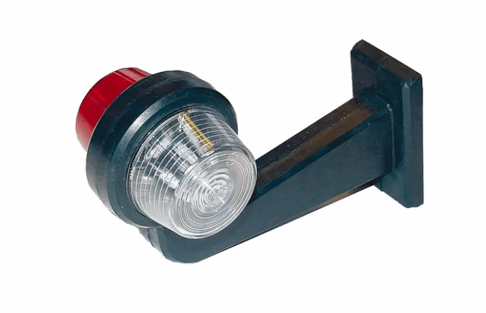 Gylle sidemarkeringslys LED 14-30V med 1 stk. rødt og 1 stk. hvitt glass på lang gummiarm (195mm). 4500 Kelvin.( Varmt hvit lys) 6 dioder i glasset, kun 2,4 watt. Glasset er laget i slagfast makrolon. Leveres med 2 x 5m kabel. E-merket.