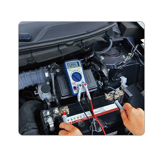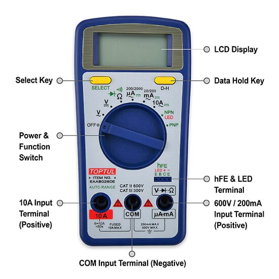 Digitalt multimeter med grunnleggende målefunksjoner Testledningssett med testspiss (rød/svart) Sentral skivebryter Stor LCD med 3-1/2-sifret display 2000 tellinger Indikator for lavt batteri og automatisk avstenging (etter 15 minutter) Tilleggsfunksjoner: Datahold, automatisk rekkevidde, automatisk avslåingsvalg, automatisk avstenging