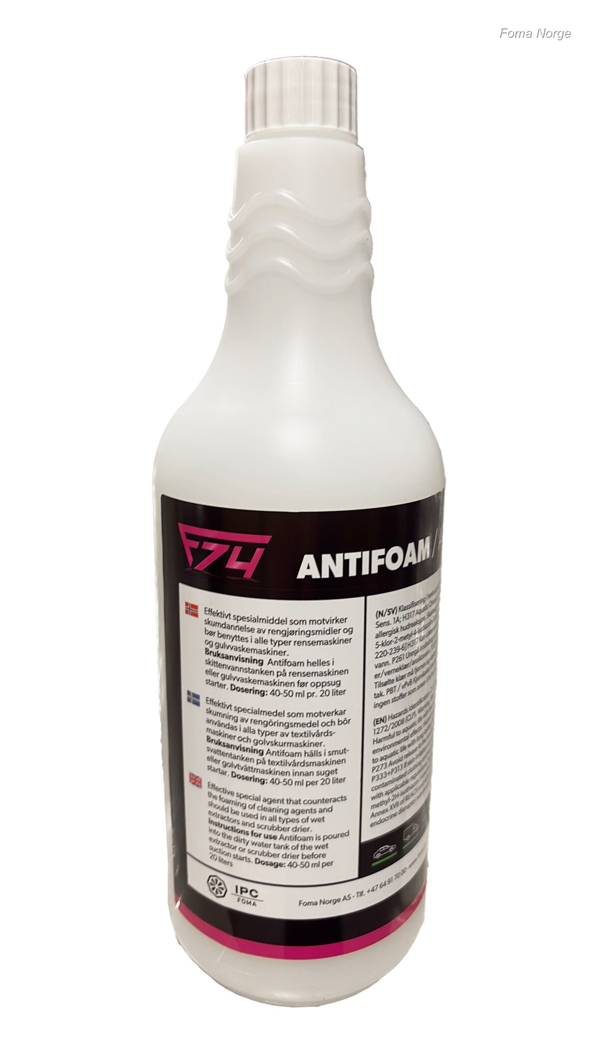 F74 Antifoam er et spesialmiddel som motvirker skumming av rengjøringsmidler. Bør benyttes i alle typer rensemaskiner. Skumdemperen vil skåne maskinen mot overskumming og forlenge levetiden på maskinen.