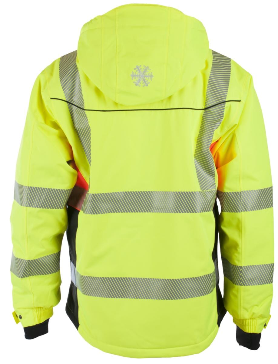 Vinterjakke med avtagbar hette med stramming. Fleece i krage. Id-kort lomme med glidelås høyre bryst, to innvendige brystlommer. Innvendig mobillomme venstre side. Stikklommer med glidelås. Pulsvarmer og linning med trykknapp rundt håndledd. Glidelås med klaff og borrelås i front. Refleks på skuldre, mage og ermer.