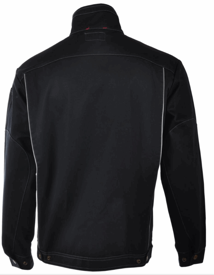 Jakke med fold i rygg, stikklommer, brystlommer, id-kortlomme og mobillomme. Glidelås med klaff i front. Trykknapper for regulering rundt håndledd og liv. Refleks i bise.
