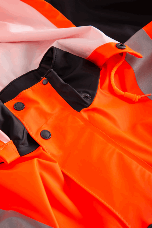 REGNJAKKE I PU KVALITET OG SYNLIGHETSKLASSE 3