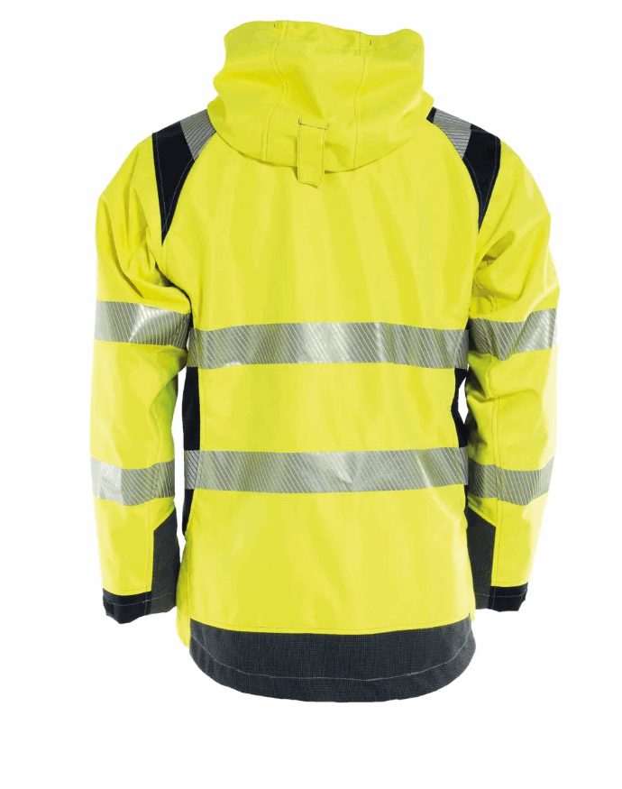 Jakken er egonomisk utformet for arbeid med armene over hodet. Skjult glidelås og dobbel stormklaff med trykknapper i front. Avtakbar og justerbar hette. Hemper for kommunikasjonsutstyr. Brystlommer med glidelås. To innerlommer med glidelås der den ene er for dokument/lesebrett og med integrert telefonlomme. Sidelommer med glidelås. Justerbar mansjett og pulsvarmer. Snøring nederst. HTFR Dobby forsterkning nederst på rygg og på armer. Transfer refleks for økt komfort. Kan utstyres med 9128 pilefor. *Plagget er sertifisert sammen med Tranemo sine bukser og selebukser sertifisert i EN ISO 20471 CL.1 og CL.2 slik at de sammen oppnår EN ISO 20471 CL.3. **Hetten skal enten brukes eller fjernes ved sveisearbeid eller arbeid med kjemikalier.
