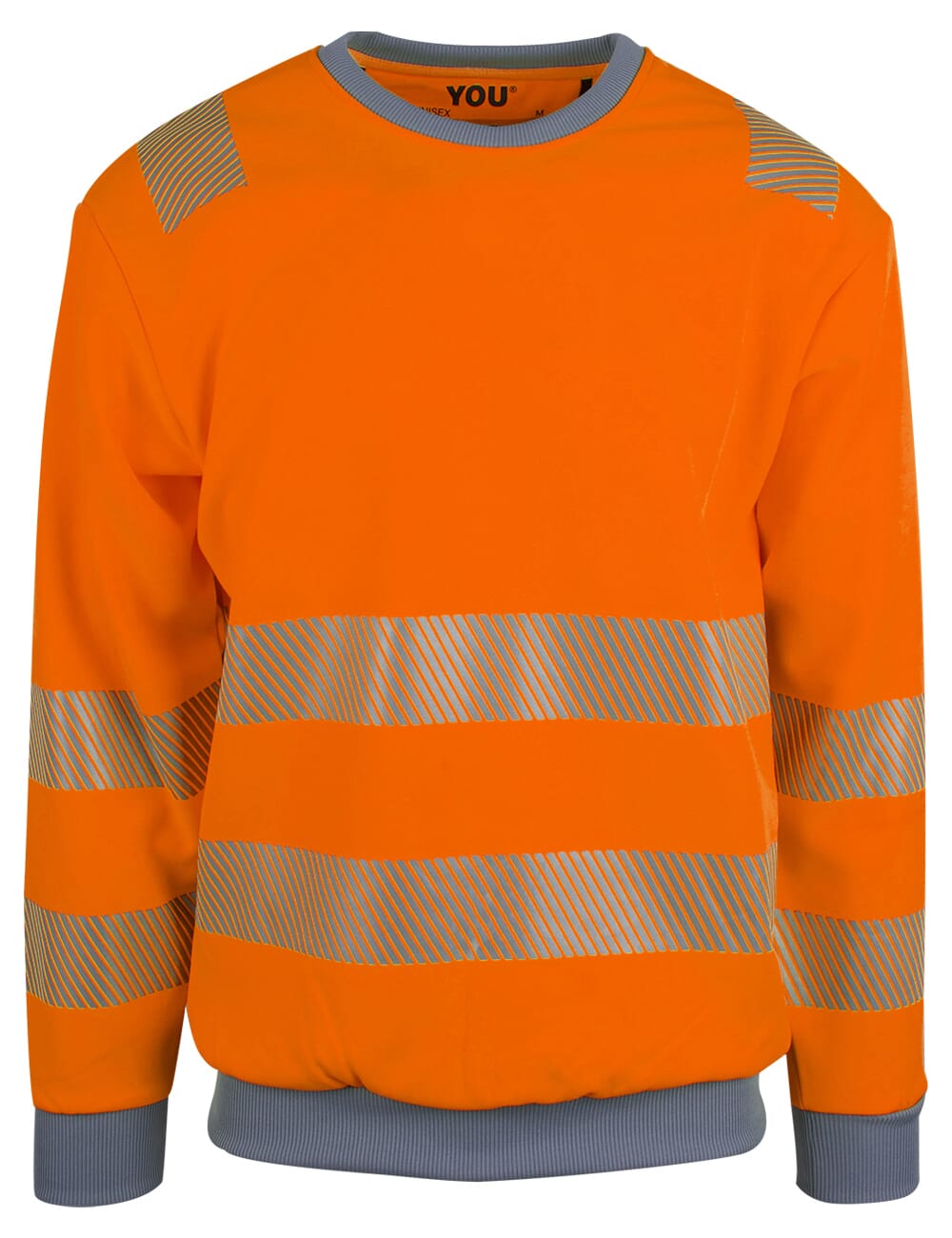 Unisex Pro-dry sweatshirt med elastiske refleksstriper på skuldre, ermer og mage. Kontrastfarget rib i hals, mansjetter og linning. Pustende og fukttransporterende stoff gjør den perfekt til aktivitet. CE-merket. EN 20471, klasse 2.