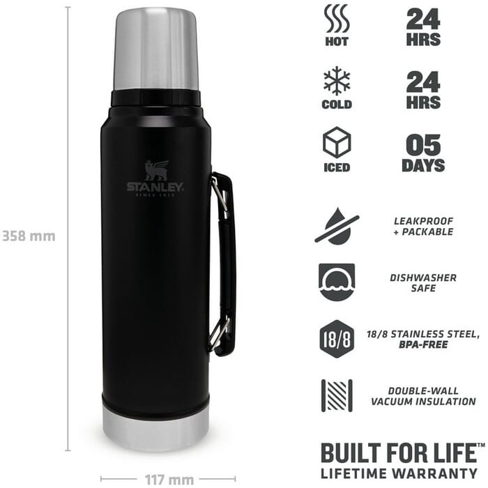 Termosen er laget i kraftig rustfritt stål, og er naturlig BPA- fri. Volum: 1 liter. Termosen kommer matt sort (Matte black).