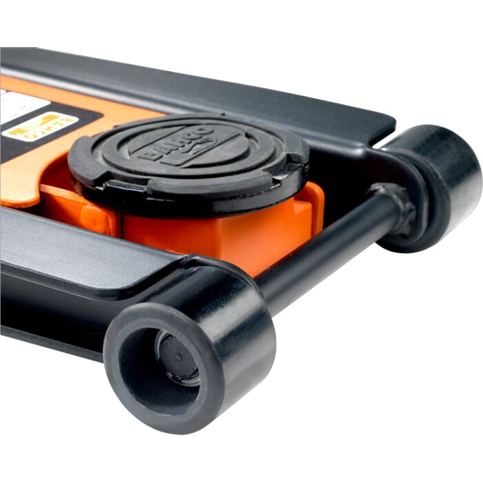 Gummibelagt løftesadel, PU-belagte stålhjul og behagelig håndtak.