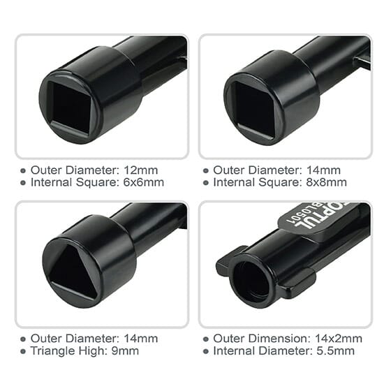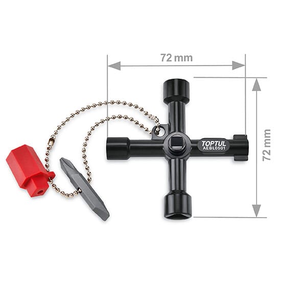Laget av slitesterk sinkstøpelegering Multifunksjonelt designet verktøy for praktisk og enkel å bruke på mange verktøysystemer Egnet for alle standard kontrollskap og avstengningssystemer for tilførsel av gass, vann og elektrisitet Også for tekniske installasjoner i bygninger, inkludert klimaanlegg og ventilasjonssystemer, stengeventiler, hovedtavler og etc. 5 forskjellige nøkkeltyper: Firkantet 5 mm, Firkantet 6 mm, Firkantet 8 mm, Trekantet 9 mm, Toveis 3-5 mm Leveres med en 1/4" sekskantadapter lenket til nøkkel Inkluderer en dobbeltsidig skrutrekkerbit med PH2 og 1,0 x 7 mm slissede ender |